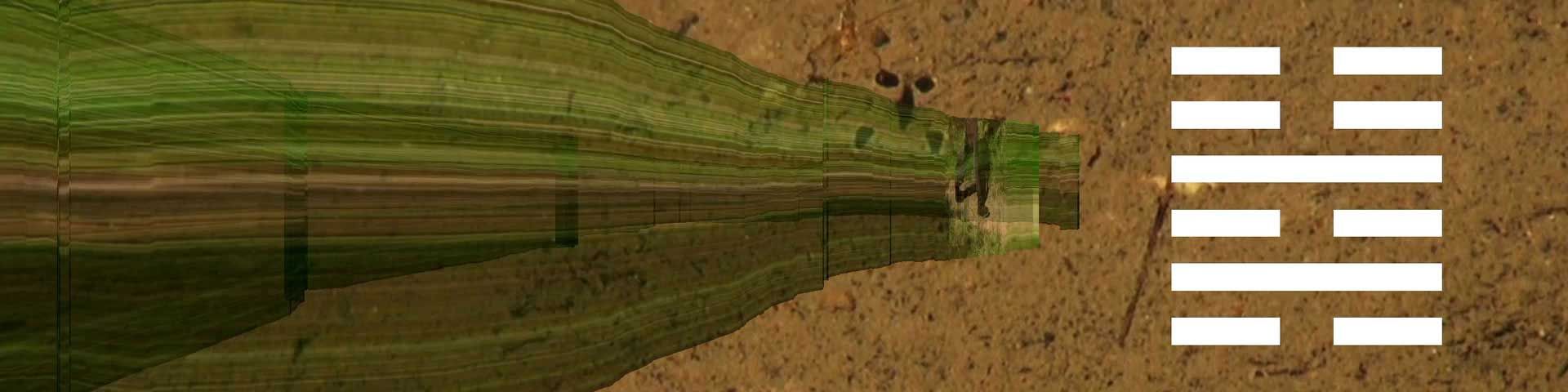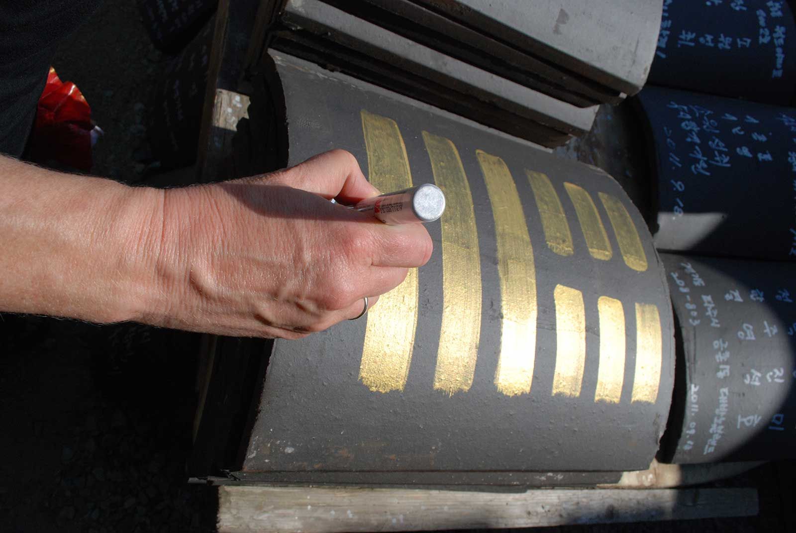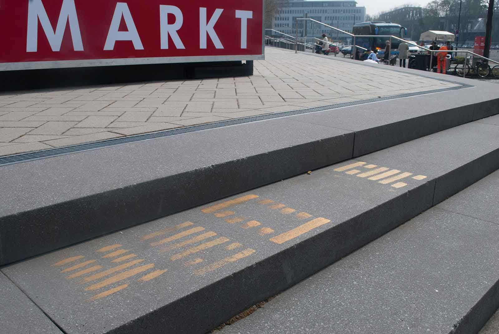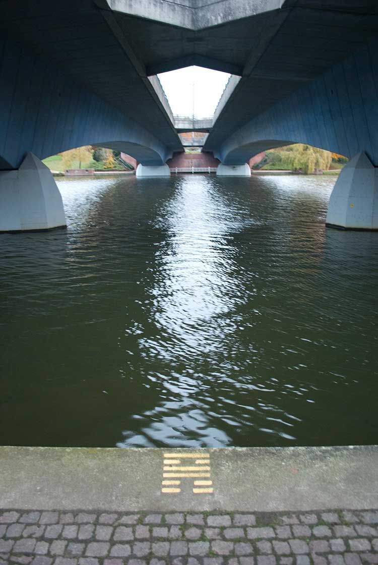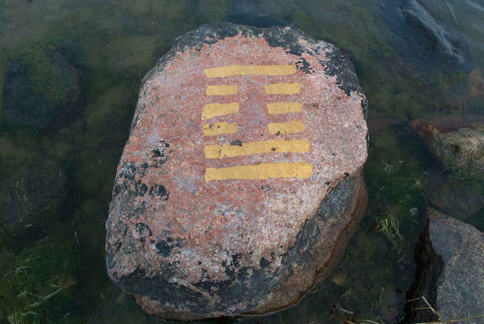 Seit längerem wildert die Kölner Künstlerin Gabriele Seifert an ausgesuchten Orten I Ging-Zeichen aus: die orakelhaften goldfarbenen Striche östlicher Herkunft geraten in die unterschiedlichsten Situationen und Zusammenhänge.