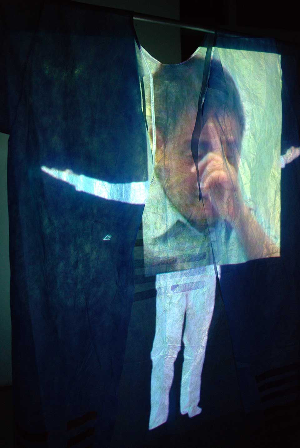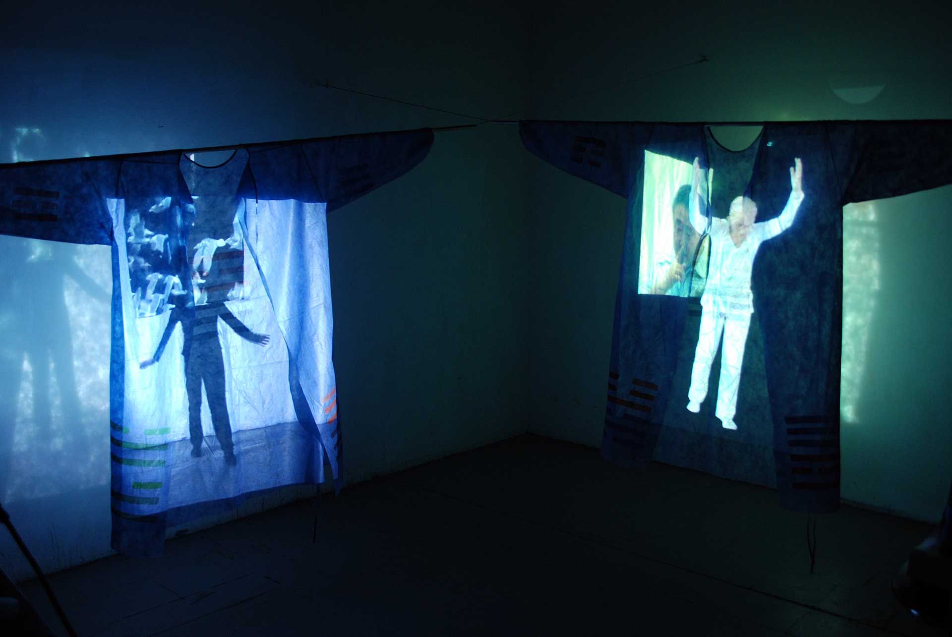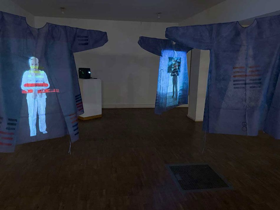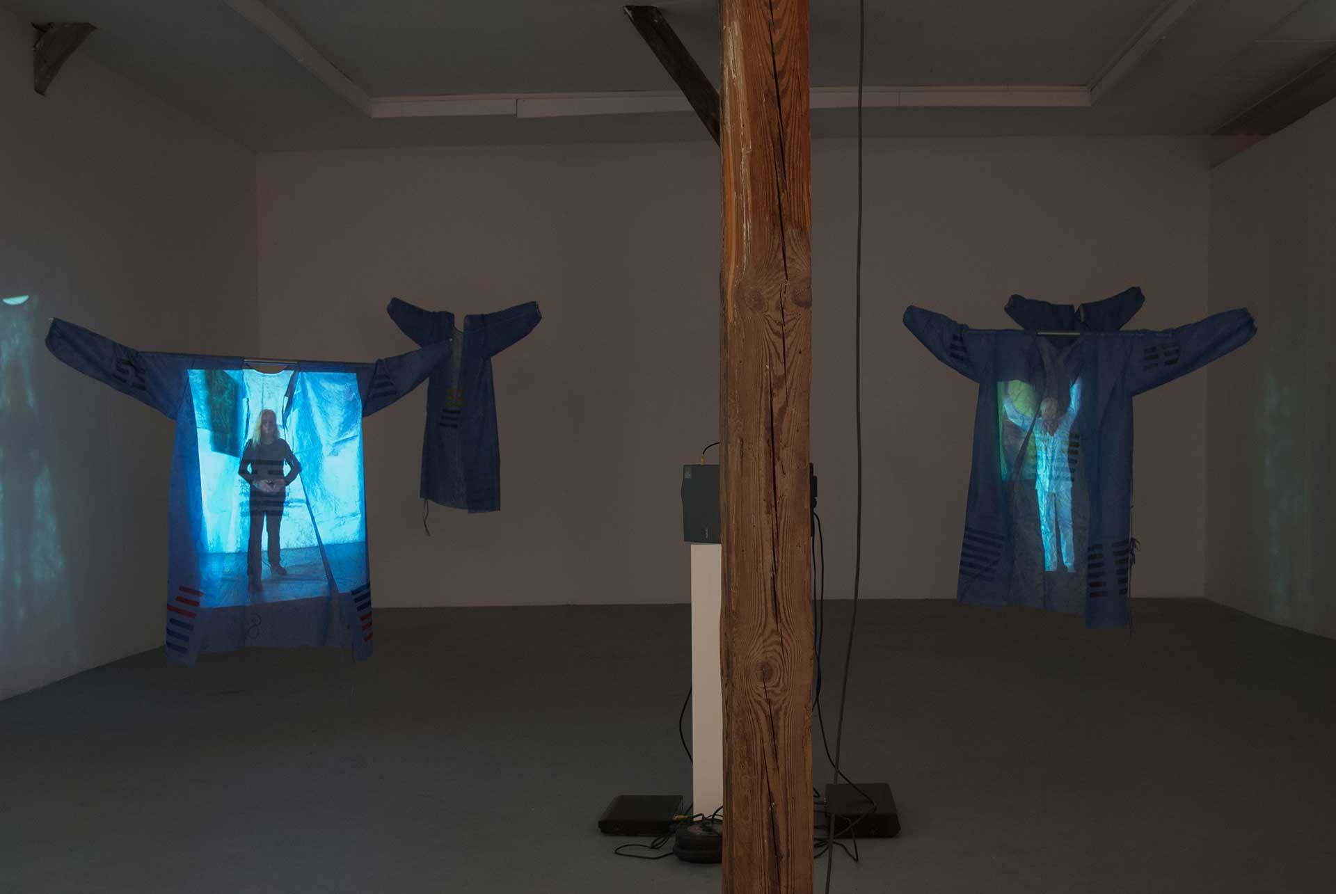 2 Videobänder, 2 Viedeoprojektoren, 2 DVD Player, 4 OP-Kittel bemalt